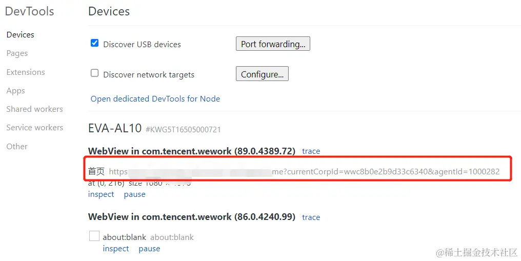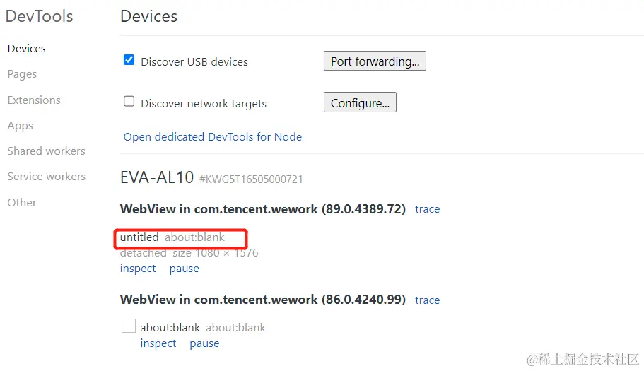 - 从Android 4.4开始,打开Android WebView的调试开关, 就能在PC端使用 chrome://inspect/#devices 远程调试原生 Android 应用中WebView H5网页。可能是Android WebView这个开关没打开。