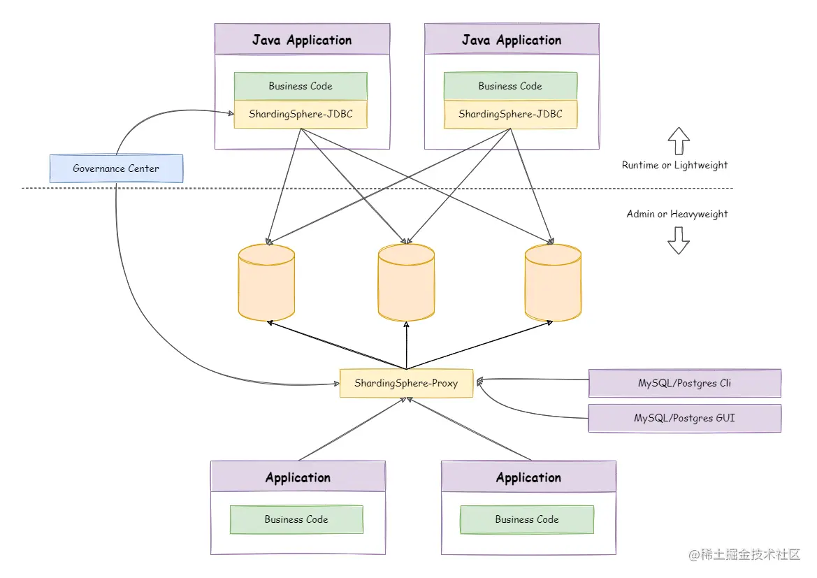 而且现在ShardingSphere支持ShardingSphere-JDBC和ShardingSphere-proxy的混合部署了,我们可以更加灵活的来进行分库分表了,这样的话我们的java应用程序可以使用JDBC 其他语言的可以使用proxy,更加灵活,而且可以通过统一注册中心来配置分片策略