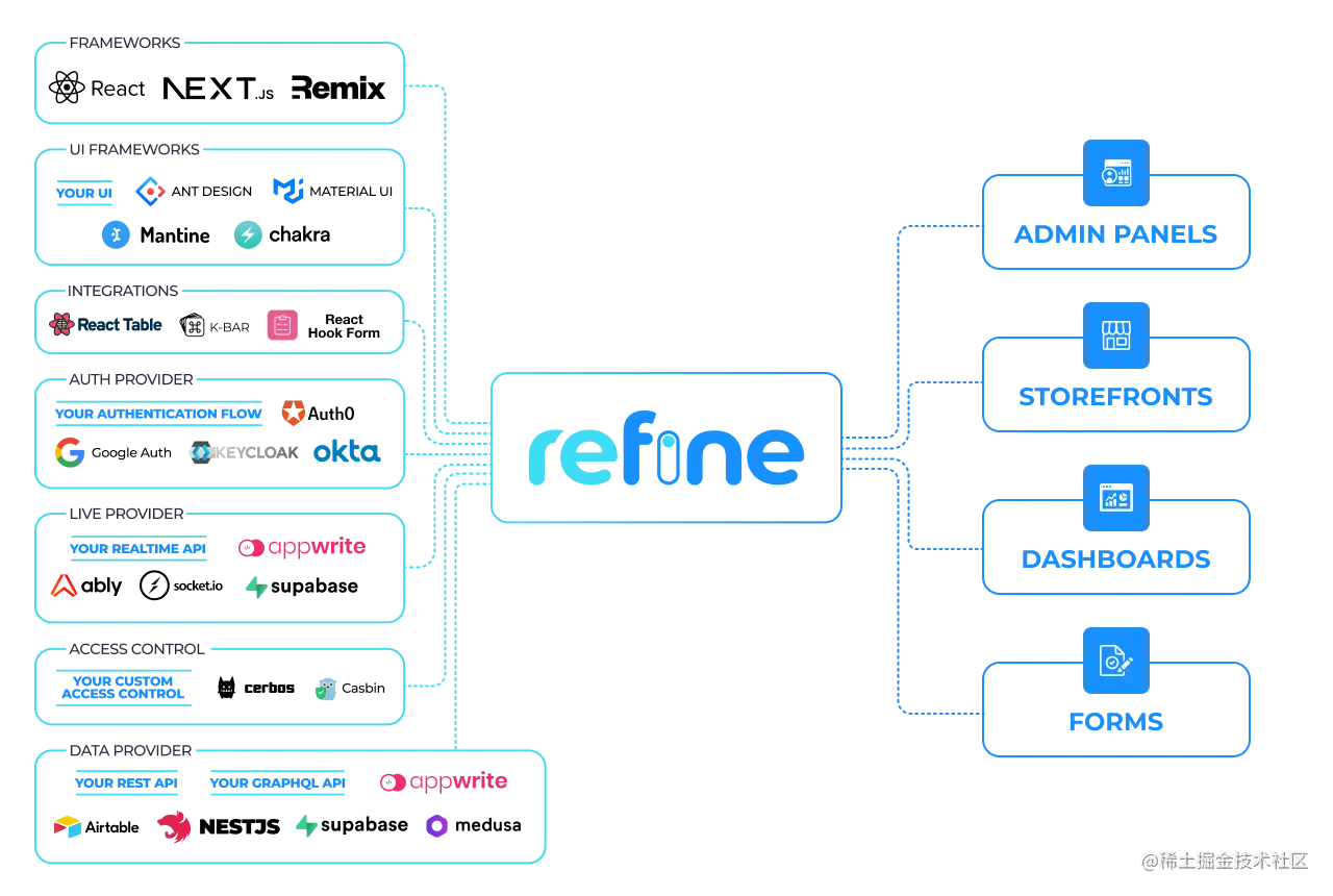 refine 是一个 React 开发框架,用于快速开发 Web 应用程序,它消除了 CRUD 操作所需的模板代码,并为身份验证、访问控制、路由、网络、状态管理和 i18n 等关键部分提供行业标准解决方案。