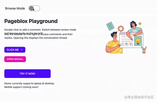 Web 应用交付时通常会有一个环节叫“设计还原度走查”,常规的走查流程是设计师 走查->截图->汇总->修改->同步->确认,如果有问题就需要重复这个过程,这是一个非常耗时且容易出错的过程,如果设计师可以直接在浏览器里的真实页面上和 figma 的标注评论一样进行走查,那团队效率将得到有效提升,pageblox 便是解决此类问题的一个产品,目前该产品还在 beta 阶段,但我已经对它的正式推出迫不及待。