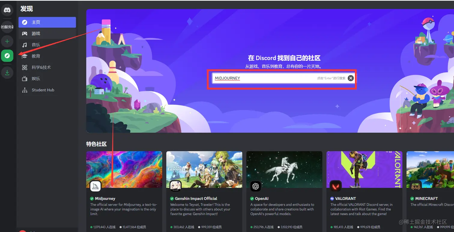 点击左边的加号,然后搜索Midjourney,或者在画面中的左下角也能看见Midjourney的服务器。