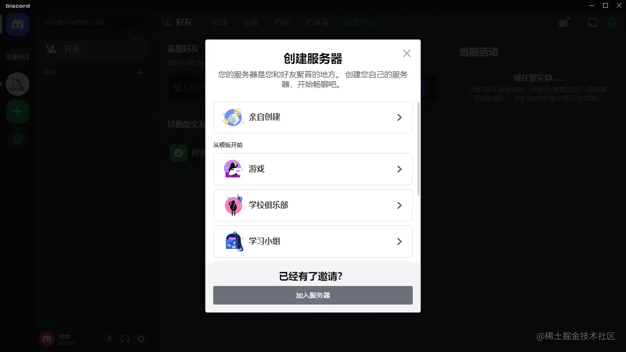 验证通过之后,我们登录,然后就会提示我们创建服务器或者加入,这无所谓的,可以选择创建,不创建就点击最下面的加入服务器,在点击去公告社区看一下就行。