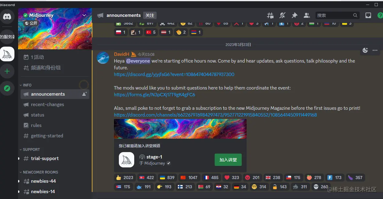 搜索到服务器之后打开,顶端会有个提示,让你加入Midjourney,有时候我们点击加入了,还会显示让你加入,只需要等一会就行,有可能是新号的问题,等个五分钟十分钟就能可以了,如果弹出那个调查的选择提,直接跳过就可以了。(图二为成功加入)然后我们就可以开始用Midjourney生成图片了。