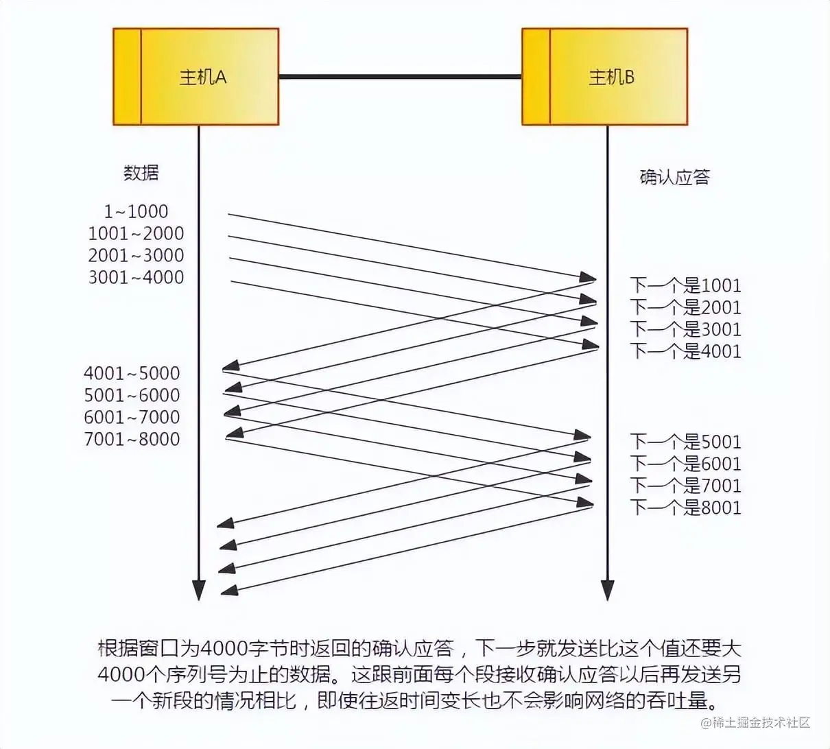 - 为解决这个问题,TCP 引入了窗口这个概念。确认应答不再是以每个分段,而是以更大的单位进行确认,转发时间将会被大幅地缩短。也就是说,发送端主机,在发送了一个段以后不必要一直等待确认应答,而是继续发送。如下图所示: