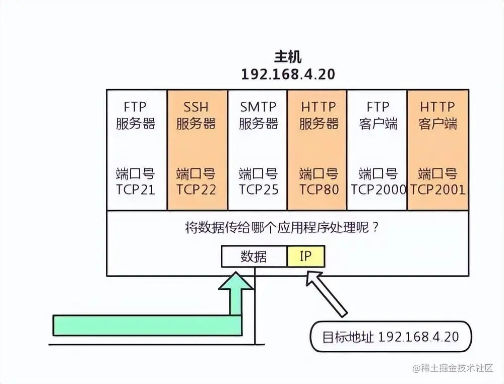 数据链路和 IP 中的地址,分别指的是 MAC 地址和 IP 地址【 www.ipdatacloud.com/?utm-source… 】。前者用来识别同一链路中不同的计算机,后者用来识别 TCP/IP 网络中互连的主机和路由器。在传输层也有这种类似于地址的概念,那就是端口号。端口号用来识别同一台计算机中进行通信的不同应用程序。因此,它也被称为程序地址。