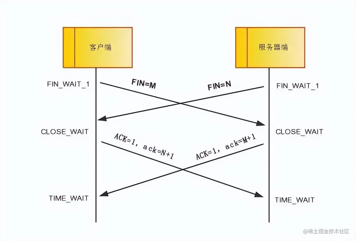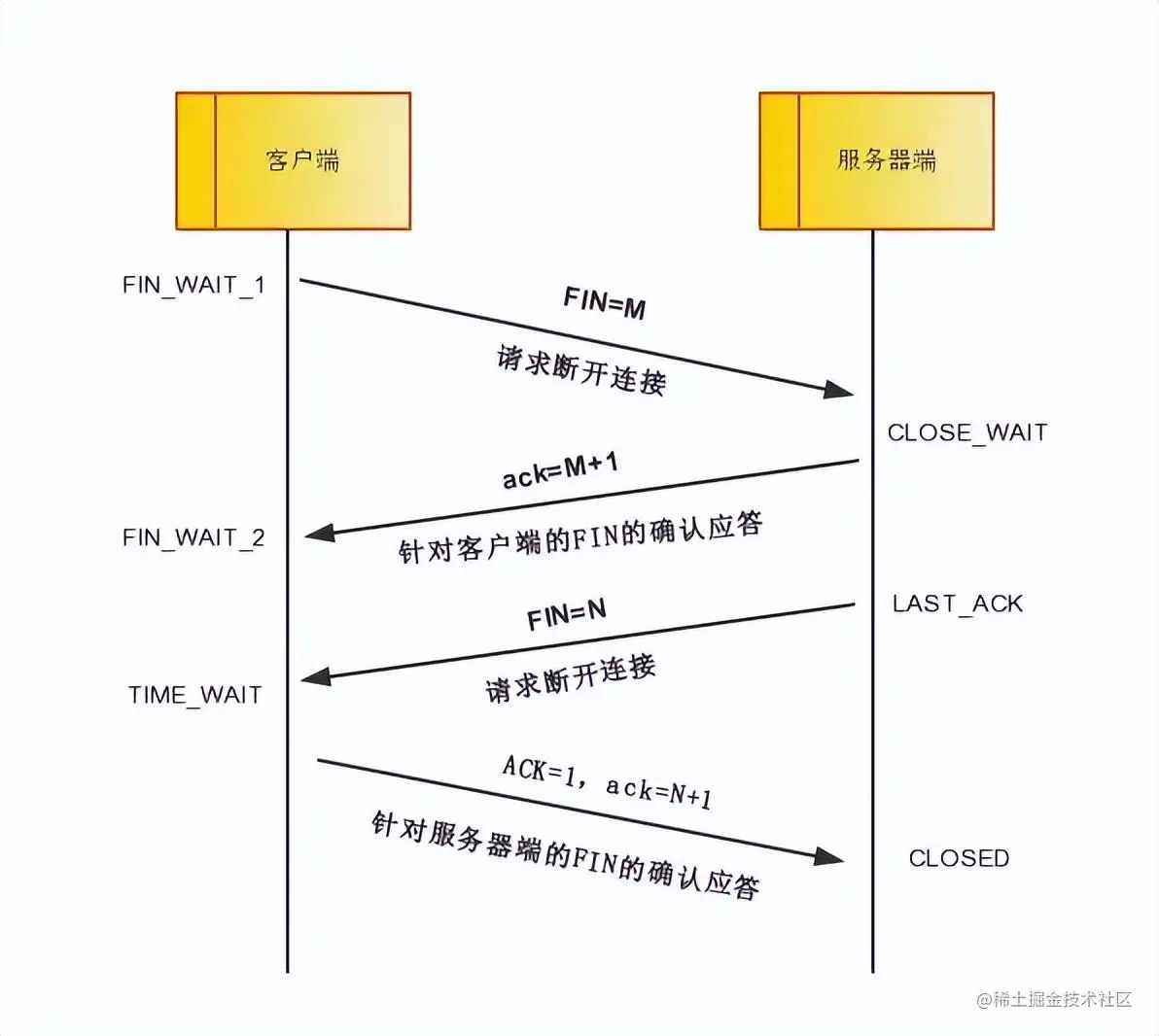 - 第四次挥手:客户端收到FIN=N报文后,就知道可以关闭连接了,但是他还是不相信网络,怕服务器端不知道要关闭,所以发送ack=N+1后进入TIME_WAIT状态,如果Server端没有收到ACK则可以重传。服务器端收到ACK后,就知道可以断开连接了。客户端等待了2MSL后依然没有收到回复,则证明服务器端已正常关闭,那好,我客户端也可以关闭连接了。最终完成了四次握手。