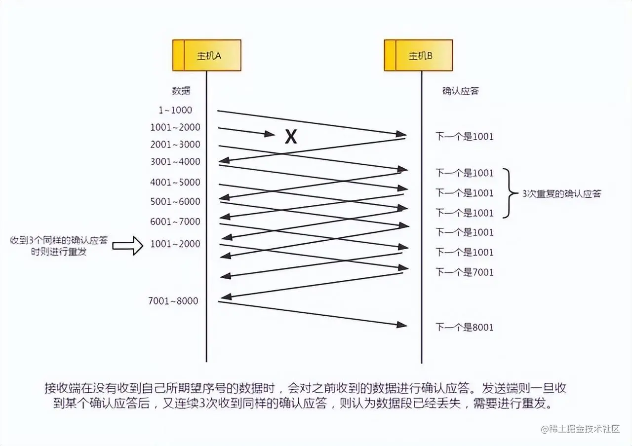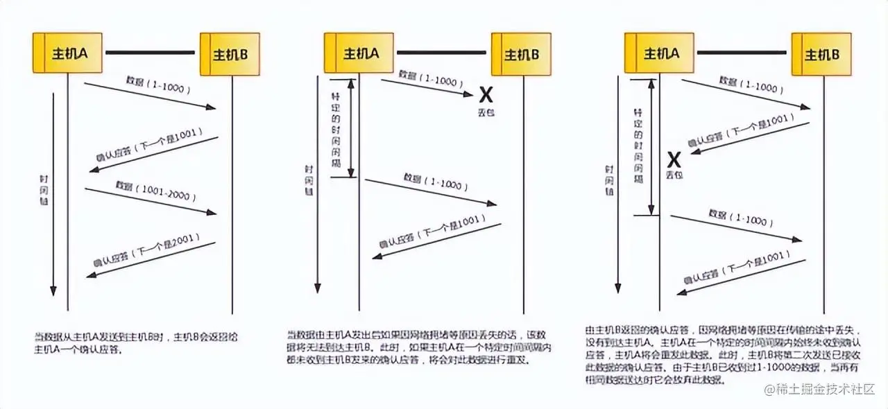 - 未收到确认应答并不意味着数据一定丢失。也有可能是数据对方已经收到,只是返回的确认应答在途中丢失。这种情况也会导致发送端误以为数据没有到达目的地而重发数据。