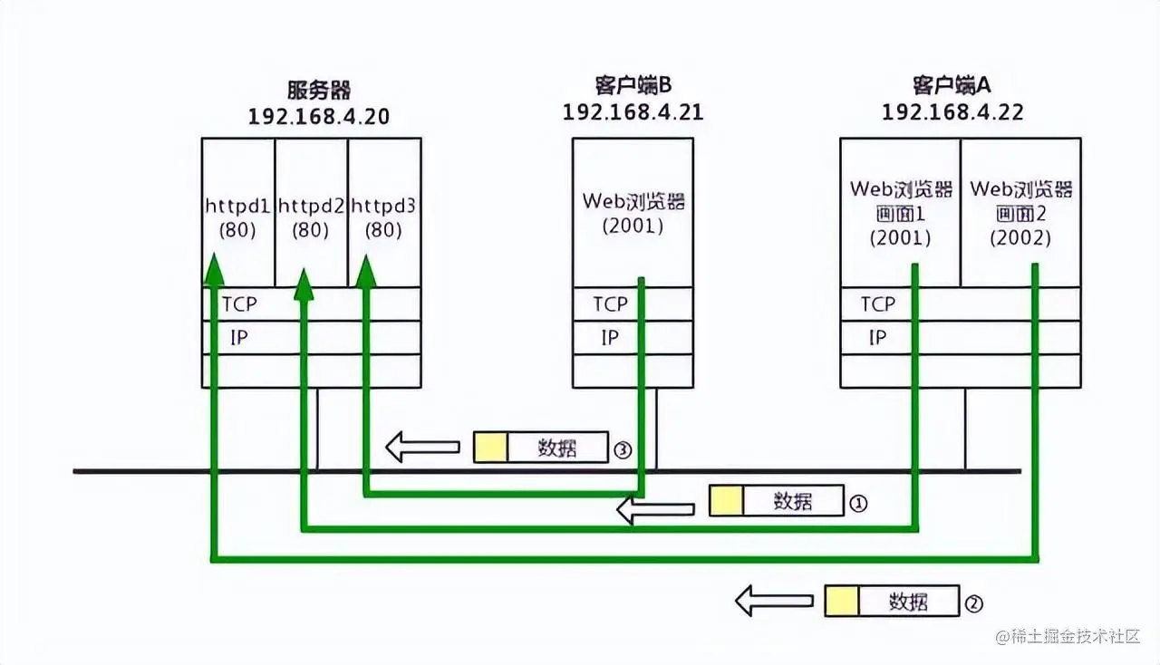 - ① 和② 的通信是在两台计算机上进行的。它们的目标端口号相同,都是80。这里可以根据源端口号加以区分。