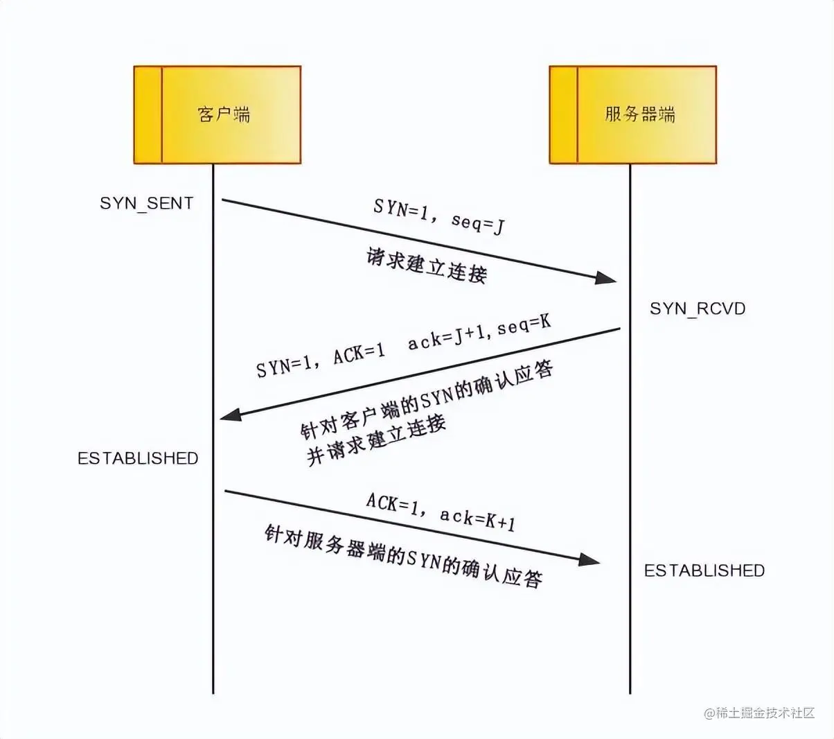 - 第二次握手:服务器端收到数据包后由标志位SYN=1知道客户端请求建立连接,服务器端将标志位SYN和ACK都置为1,ack=J+1,随机产生一个值seq=K,并将该数据包发送给客户端以确认连接请求,服务器端进入SYN_RCVD状态。