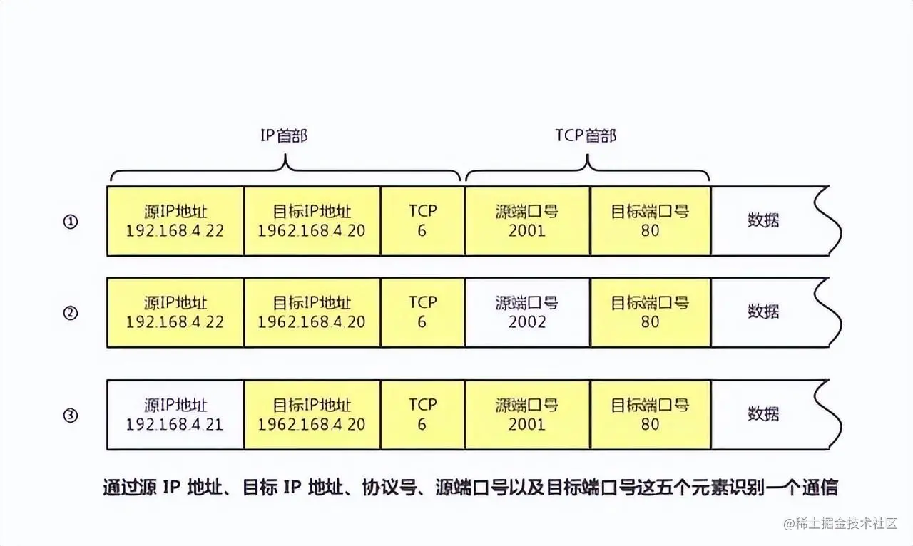 - ③ 和 ① 的目标端口号和源端口号完全相同,但它们各自的源 IP 地址不同。