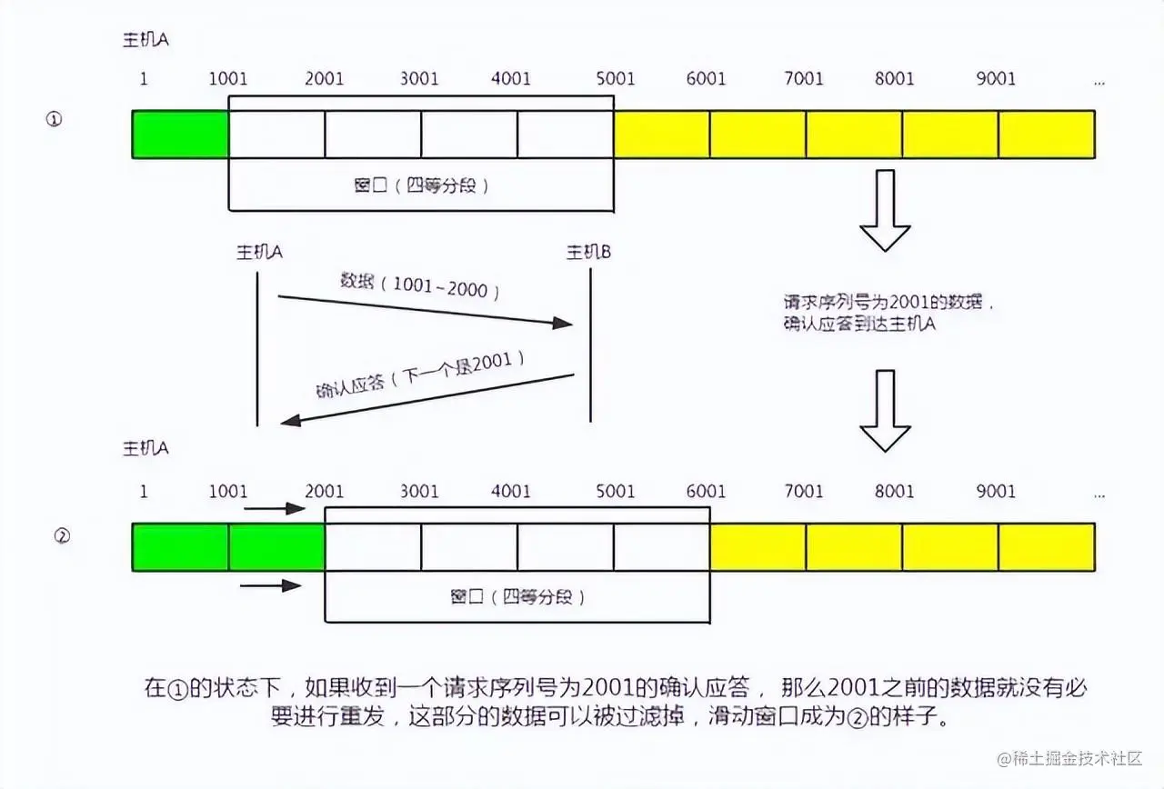 - 收到确认应答的情况下,将窗口滑动到确认应答中的序列号的位置。这样可以顺序地将多个段同时发送提高通信性能。这种机制也别称为滑动窗口控制。