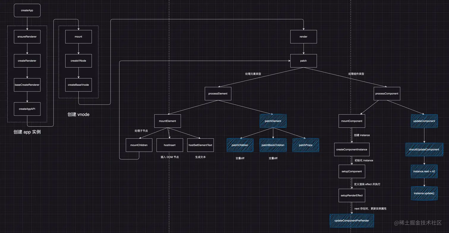 最后在上次的挂载流程图上,补充组件过程过程的逻辑(蓝色部分)