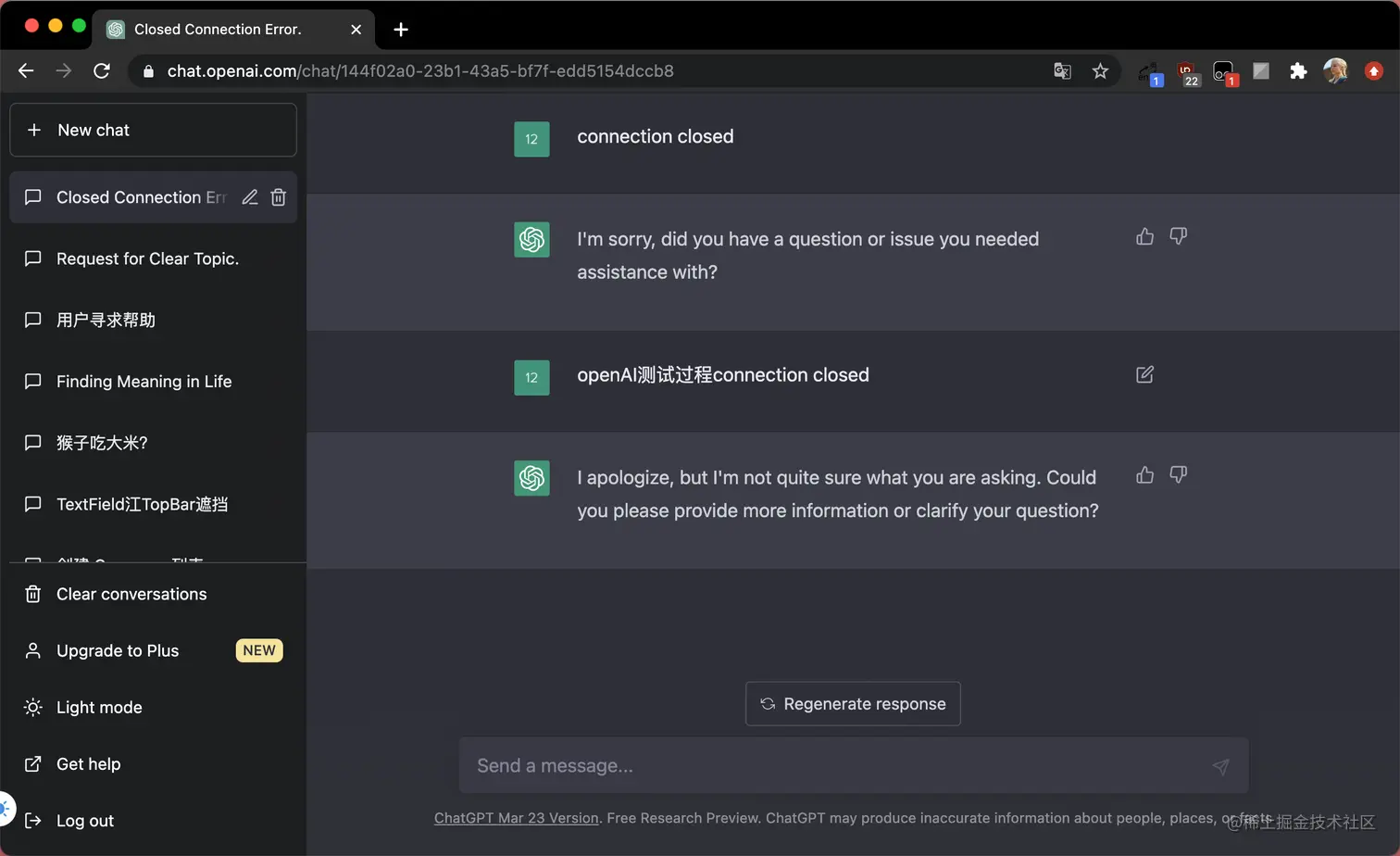 在输入框上部有个Regenerate response和Stop generating可以切换的按钮。当请求加载数据过程可以停止,而数据停止之后,可以点击Regenerate response再次请求。