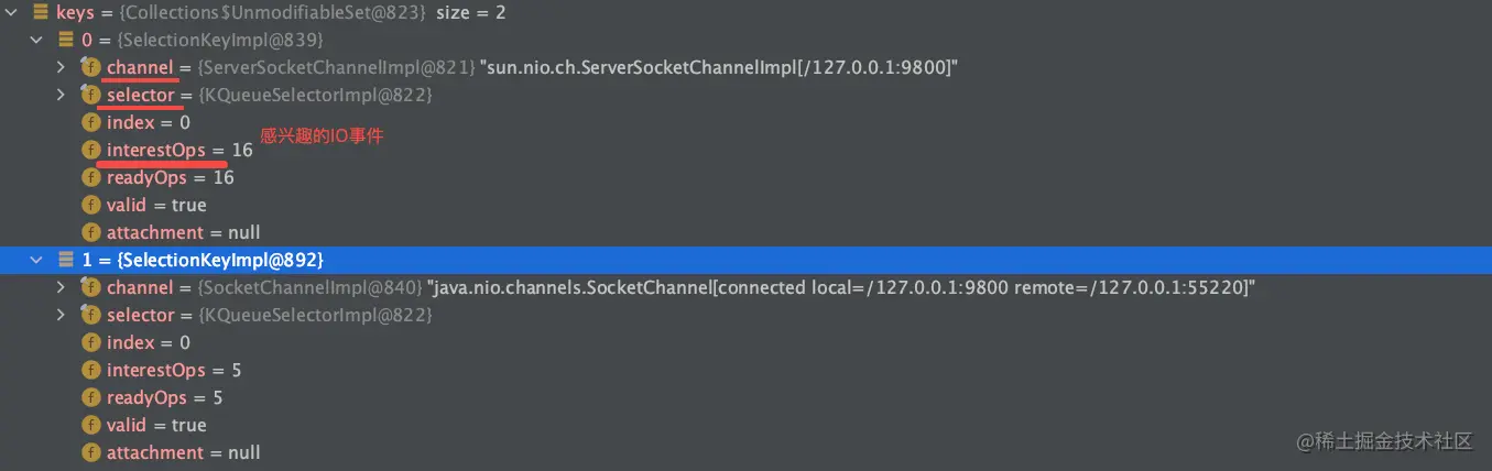 Channel注册到Selector中的时候就会生成一个SelectionKey对象,并添加到Selector的keys集合中(可看源码)。SelectionKey对象封装了Selector、Channel和感兴趣的IO事件,如下: