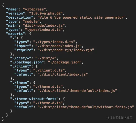 除了require和default还可以设置types和import属性用于指定,类型定义文件和ESM资源