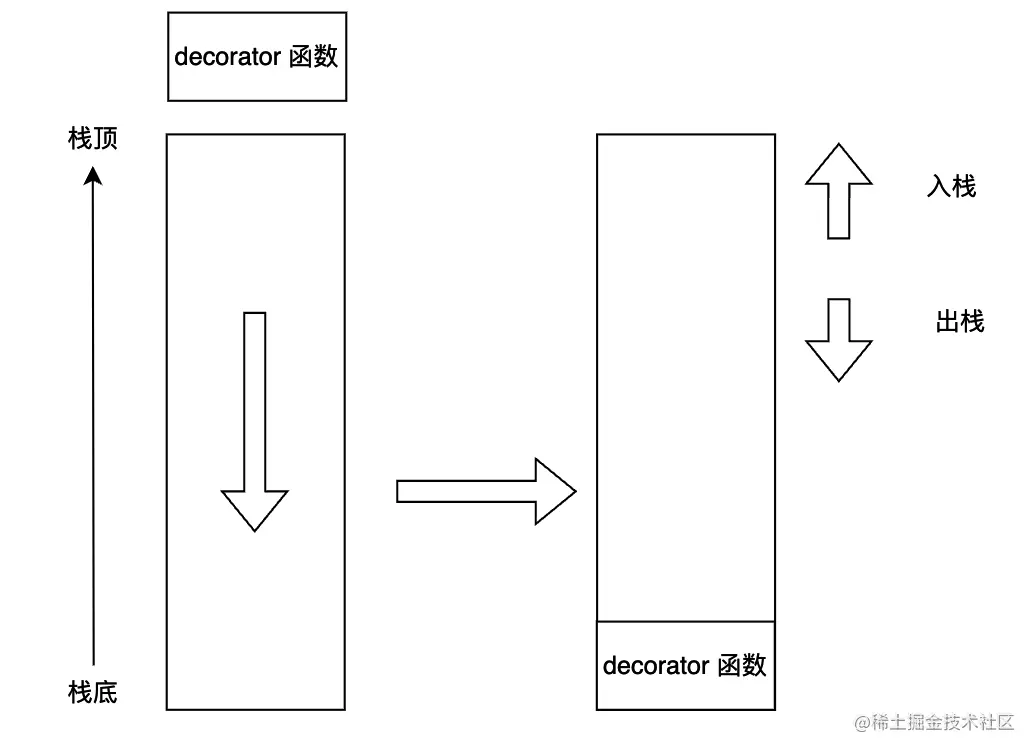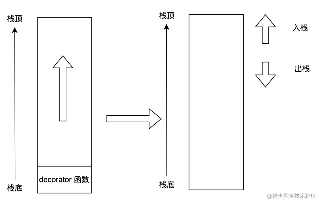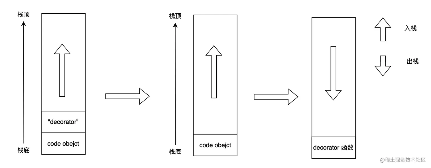 - 执行第三条指令 MAKE_FUNCTION,这条字节码的作用是在虚拟机内部创建一个函数,函数的名称为 decorator,函数对应的字节码则是在先前压入栈空间当中的 code object 对象,这条指令还会将创建好的函数对象压入栈中。