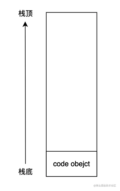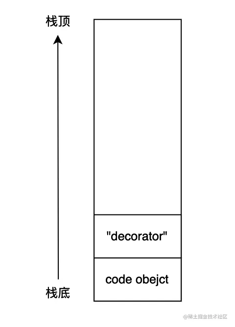 - 执行第一条指令 LOAD_CONST,这条指令主要是加载一个 code object 对象,这个对象里面主要是包含函数 decorator 的字节码,主要是上面字节码的第二块内容。在执行完这条字节码之后栈空间如下所示: