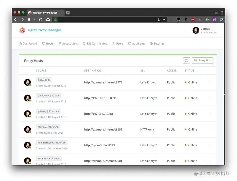 它开箱即用,支持 Docker 一键部署,可以让用户通过 Web 界面在线配置、管理 Nginx 服务,支持转发、重定向、SSL 证书、高级配置等功能。