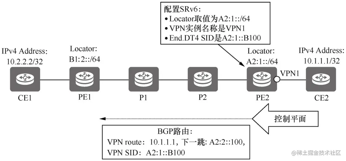 ② VPN配置与Locator路由发布:在PE2节点上配置该节点的SRv6 Locator配置为A2:1::/64,Loopback接口IPv6地址配置为A2:2::100。配置VPN1的End.DT4 SID为A2:1::B100。PE2将Locator前缀路由及Loopback路由通过IGP发布到域内各节点,各节点形成对应的路由转发表项。
