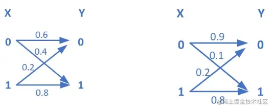 ∵p(xiyj)=p(xi)p(yj∣xi)∴p(x1y1)=0.3p(x1y2)=0.2p(x2y1)=0.1p(x2y2)=0.4p(y1)=0.4p(y2)=0.6p(x1∣y2)=43p(x1∣y2)=31p(x2∣y1)=41p(x2∣y2)=32I(X;Y)=∑i∑jp(xiyj)logp(xi)p(xi∣yj)=0.125 bit / 符号