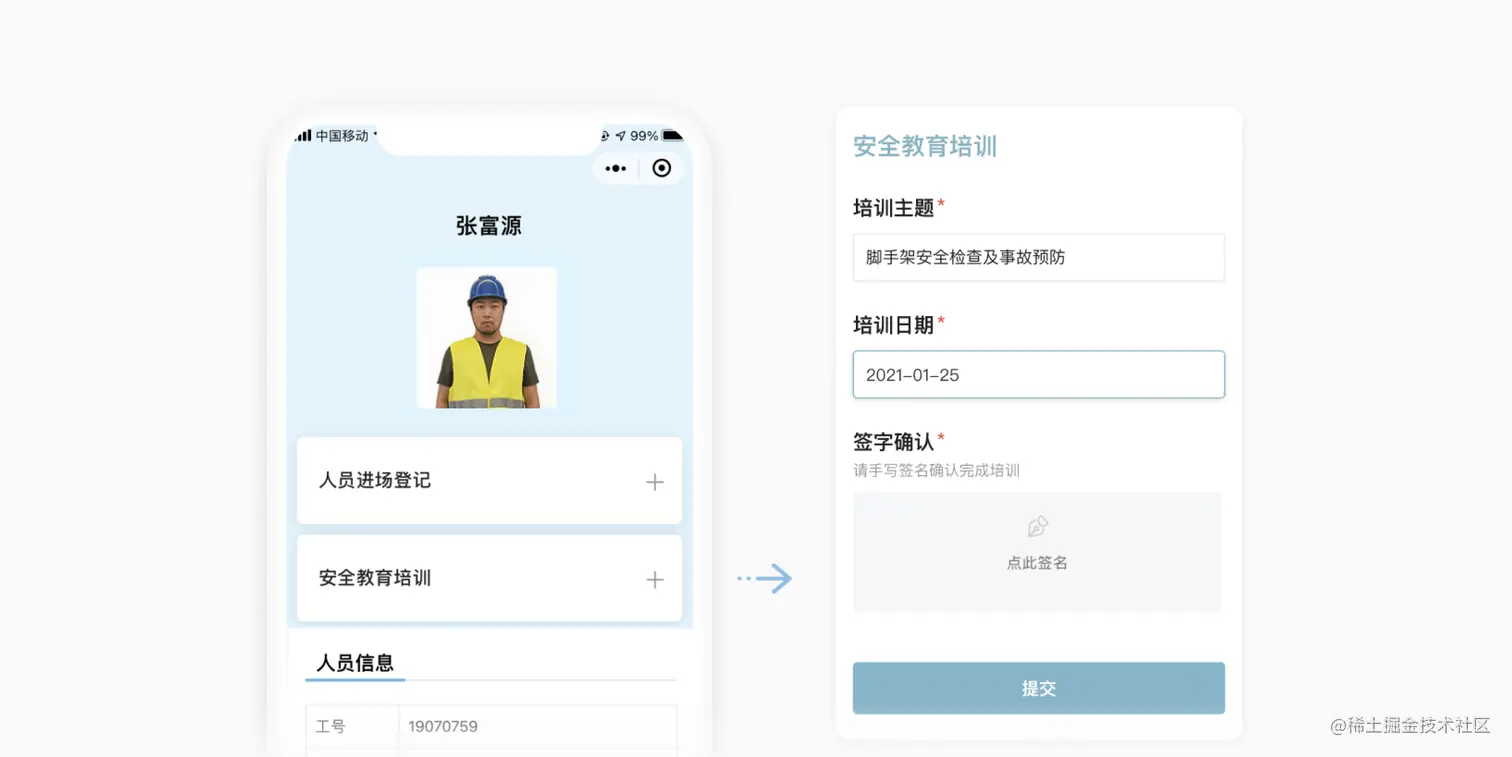 人员进场登记——对于较长的施工断面,管理场地开放,不方便设置闸机,可通过填表登记进场