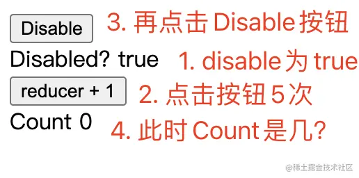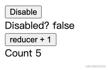 现在问题来了,当disabled props为true时(此时count为0),我们点击reducer + 1按钮5次,然后再点击Disable按钮(disabled props会变为false),此时count为多少呢?
