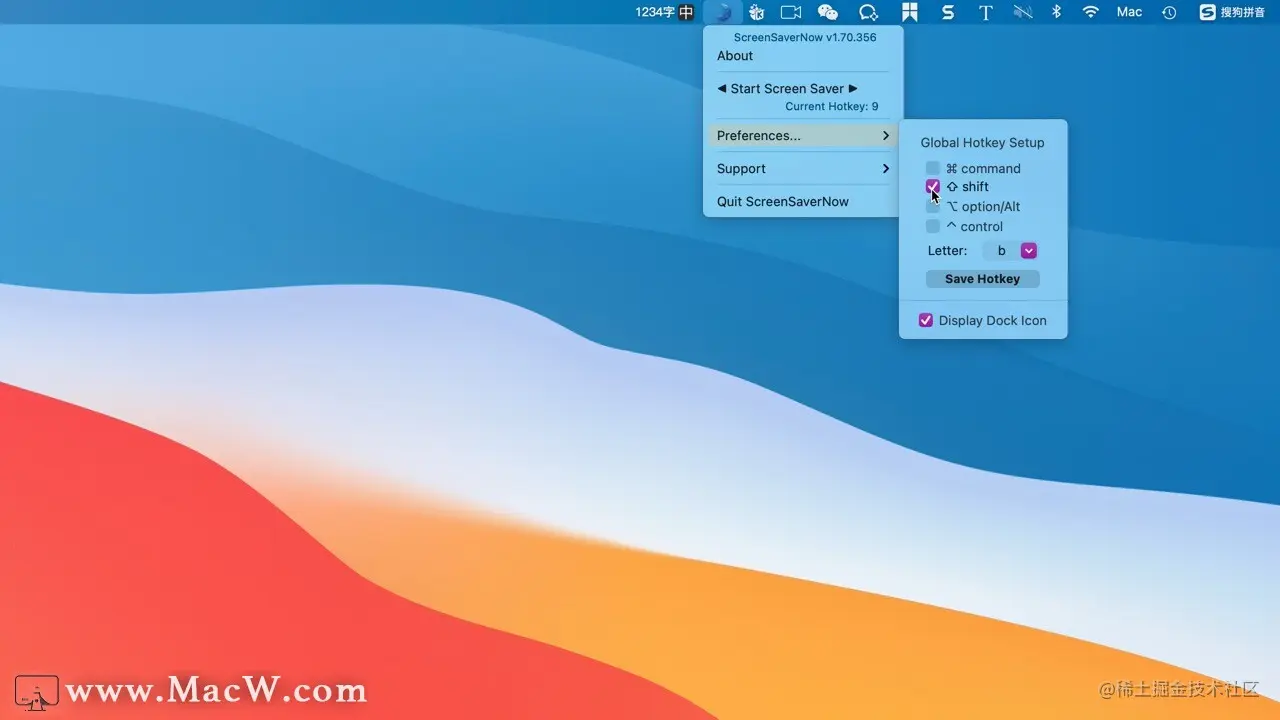 - 只需单击状态栏中的应用程序按钮,停靠图标菜单,或按您选择的热键,屏幕保护程序将立即激活!