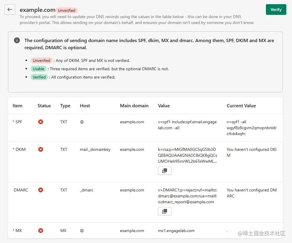 新增自有发送域名时,需要在域名的DNS服务器上配置SPF、MX、DKIM和DMARC记录,以确保邮件发送质量、接收服务的顺畅性和FBL反馈环。