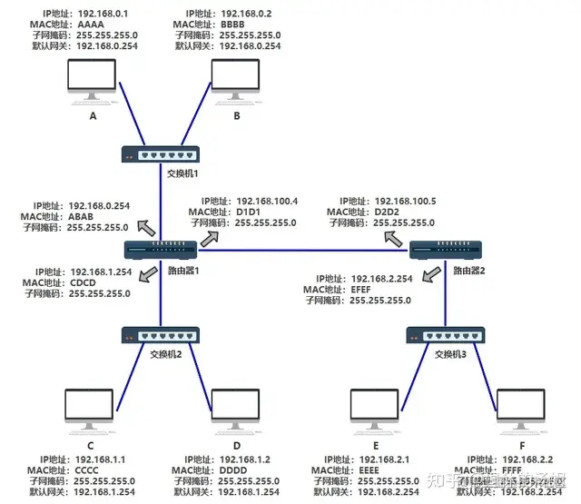 你完全不需要设计额外的东西,只需要按照之前的设计和规矩来,按照上述的接线方式即可完成所有电脑的互联,所以交换机设计的这种规则,真的很巧妙。你想想看为什么(比如 A 要发数据给 F)。