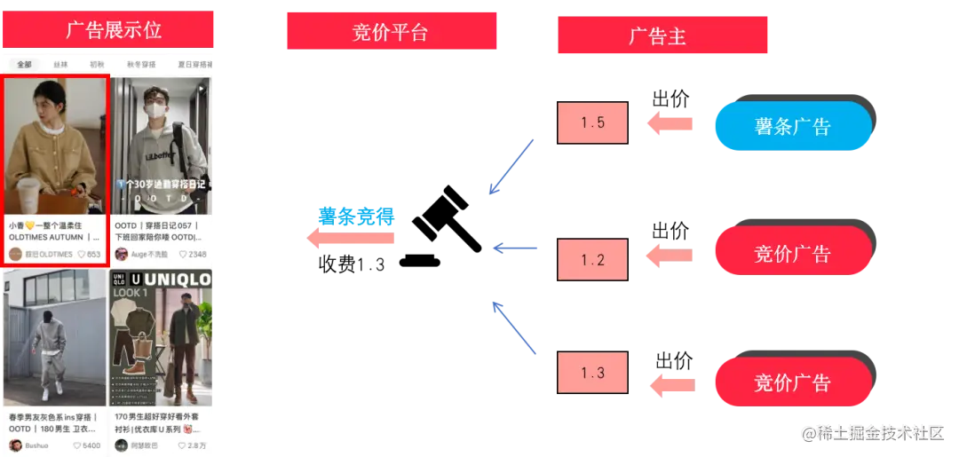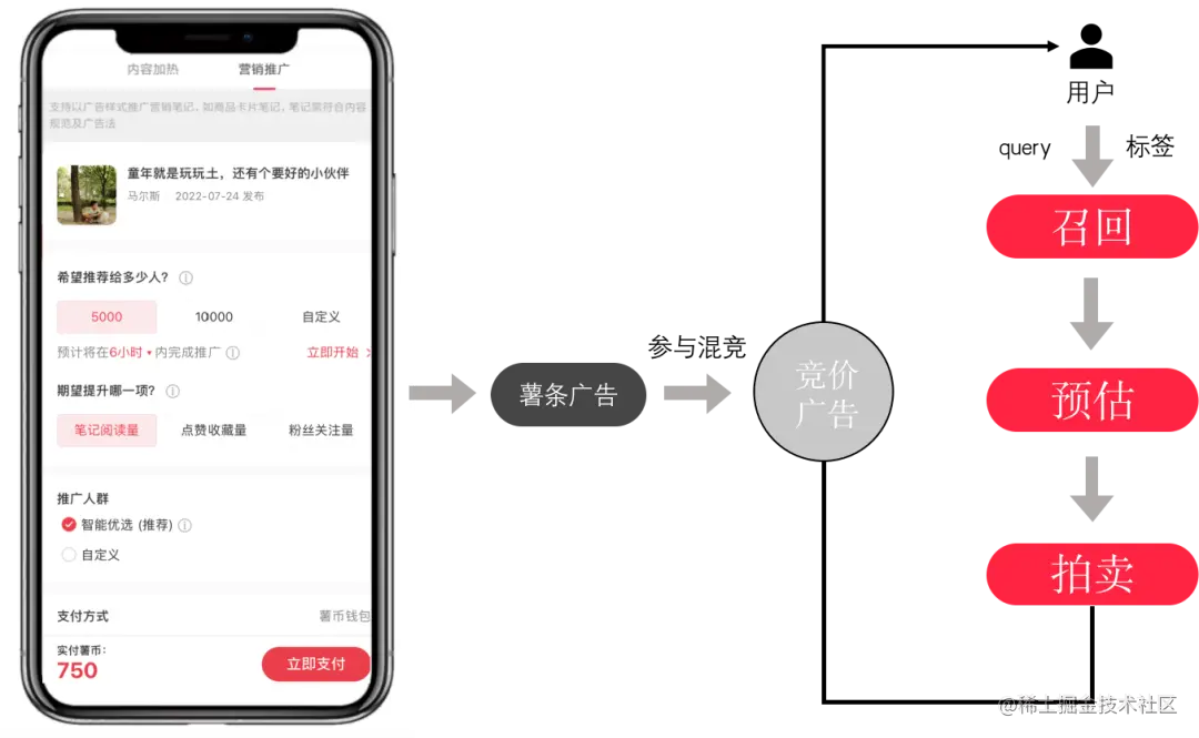 在小红书商业化矩阵中,薯条广告业务是重要一环。具体的业务形式如下图,一个用户(普通用户,KOL,甚至商家)可以通过薯条来推广自己的笔记,过程中只需要简单决定几个选项,如预期曝光量、投放时间、推广目标、人群,付款后就会自动推广了。因为薯条广告的投放过程是需要和商业化流量中其他广告进行竞争的,所以也会完整的涉及竞价广告的三个基本范式,召回、预估、拍卖(竞价)。从业务逻辑上来讲,召回、预估比较贴近业界主流的实践方式,而拍卖(竞价)过程受限于业务复杂性却存在非常多的挑战。