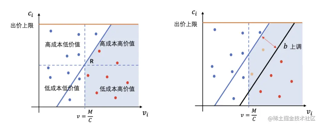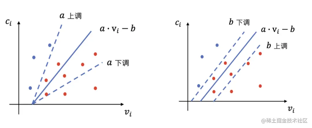 ),通过调控函数的斜率 a 和截距 b,对当前的流量进行划分,函数之下的流量均可竞得,函数之上的流量不竞得。通过对a, b的上调或下调,可以控制竞得流量的集合,最优公式下方的所有流量即为原问题最优的竞得流量集合。如下图所示。
