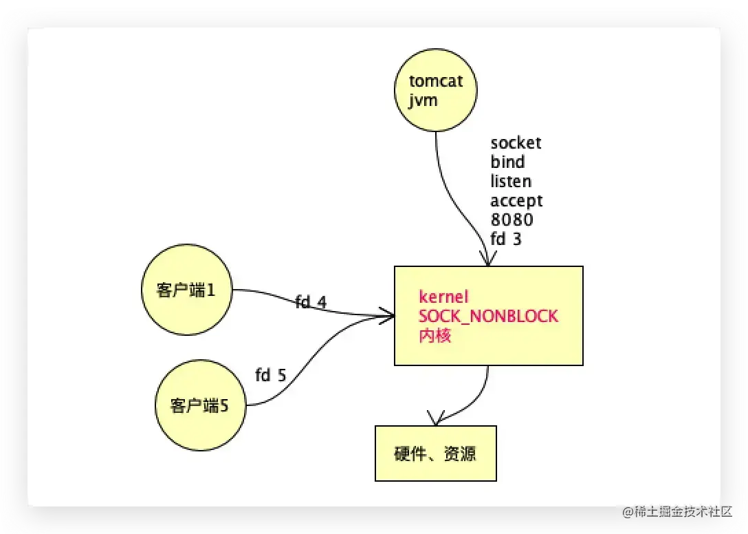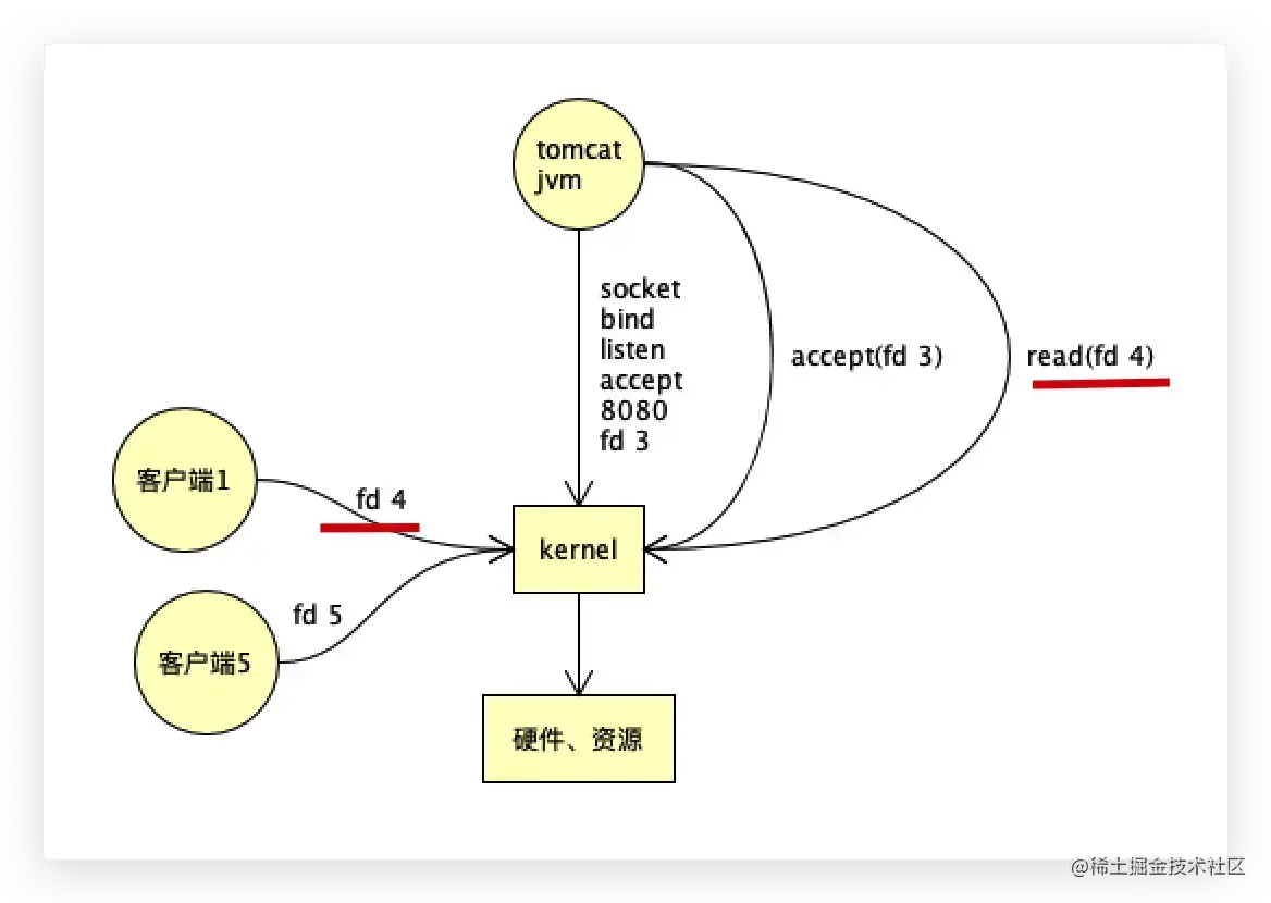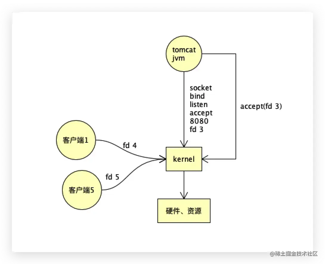 tomcat先是监听8080端口,比如得到一个fd3,来了一个客户端,到达内核说:我想和你建立连接。