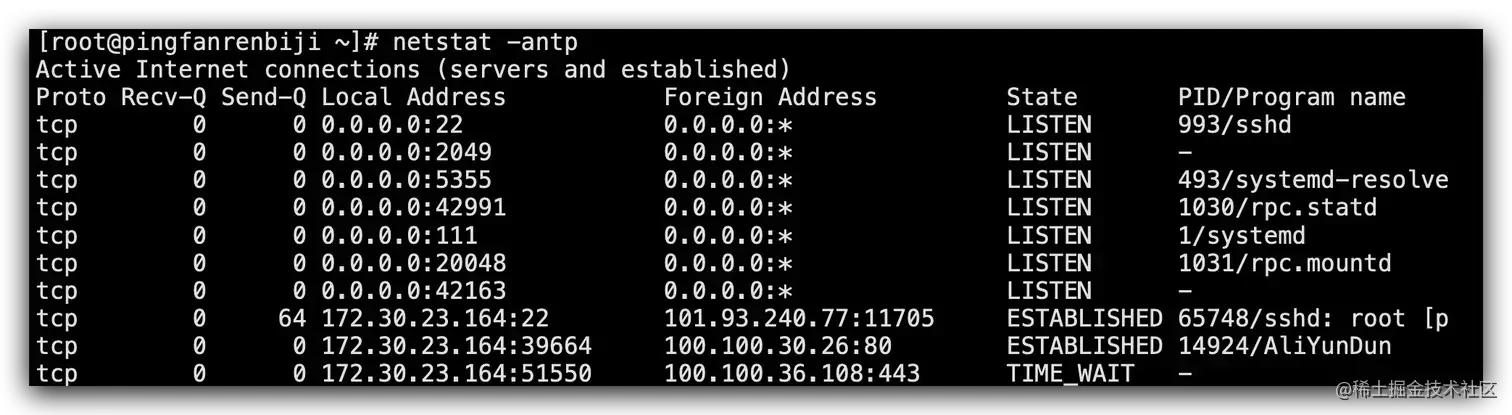 状态列state中的LISTEN是监听状态,ESTABLISHED是联通状态。