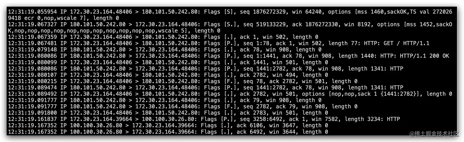 -i 是iterface接口,eth0是网卡;抓80端口,抓从eth0网卡出去的访问80端口的网络包。