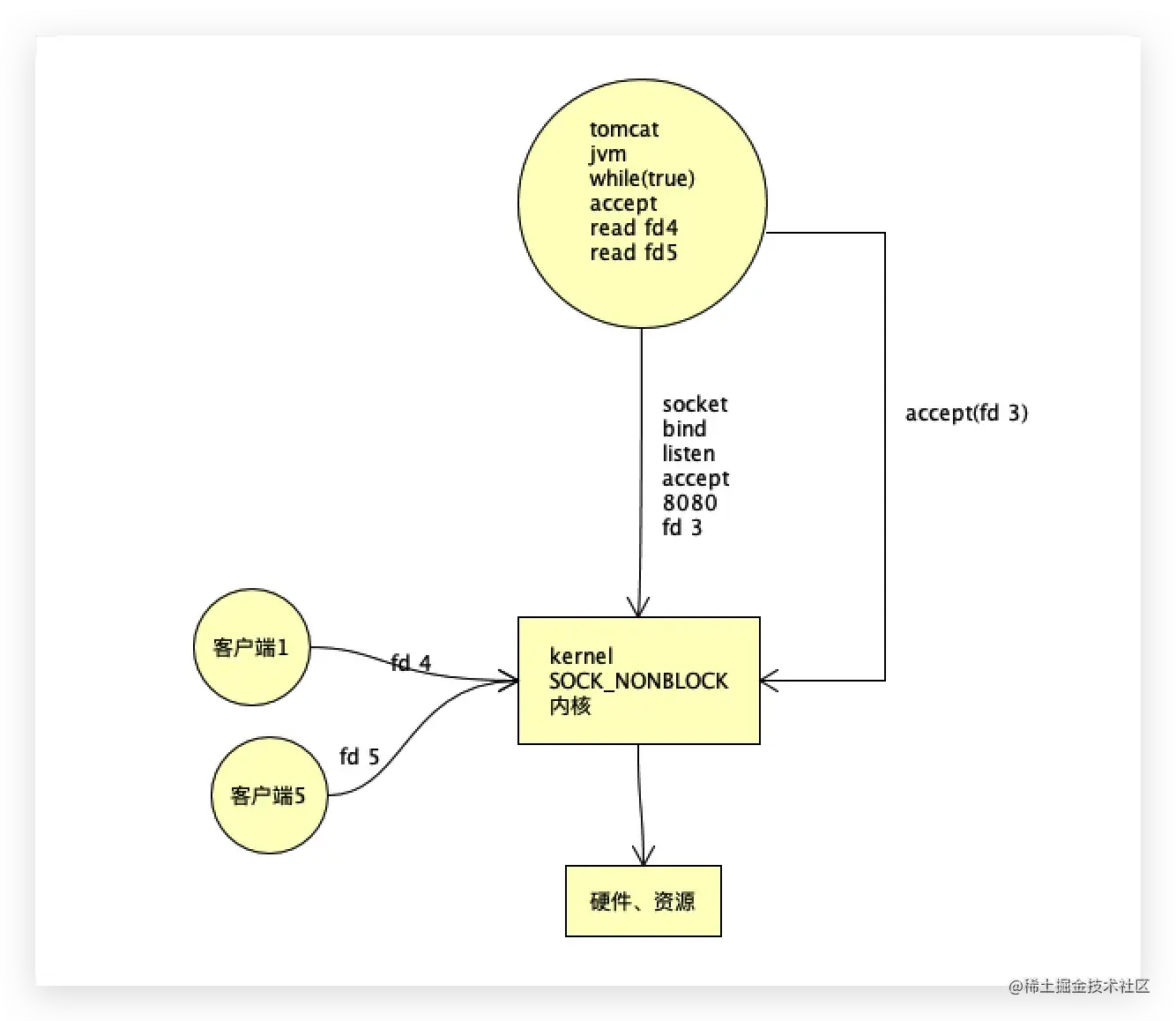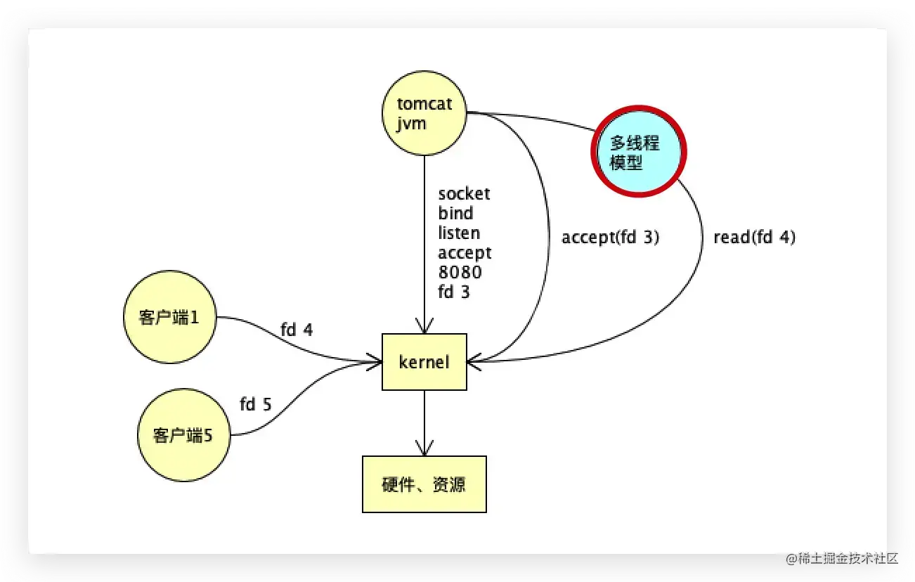 JVM主线程是一个方法,这个主方法里有一个循环,先是通过调用socket的bind、listen、accept得到一个文件描述符3,除了accept接受客户端之外,还得读写客户端中的数据,