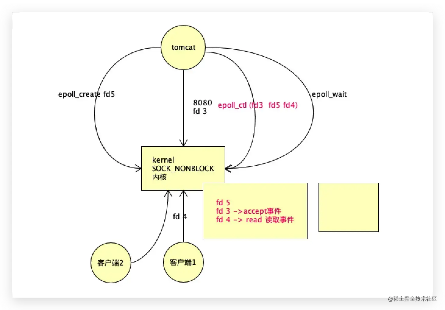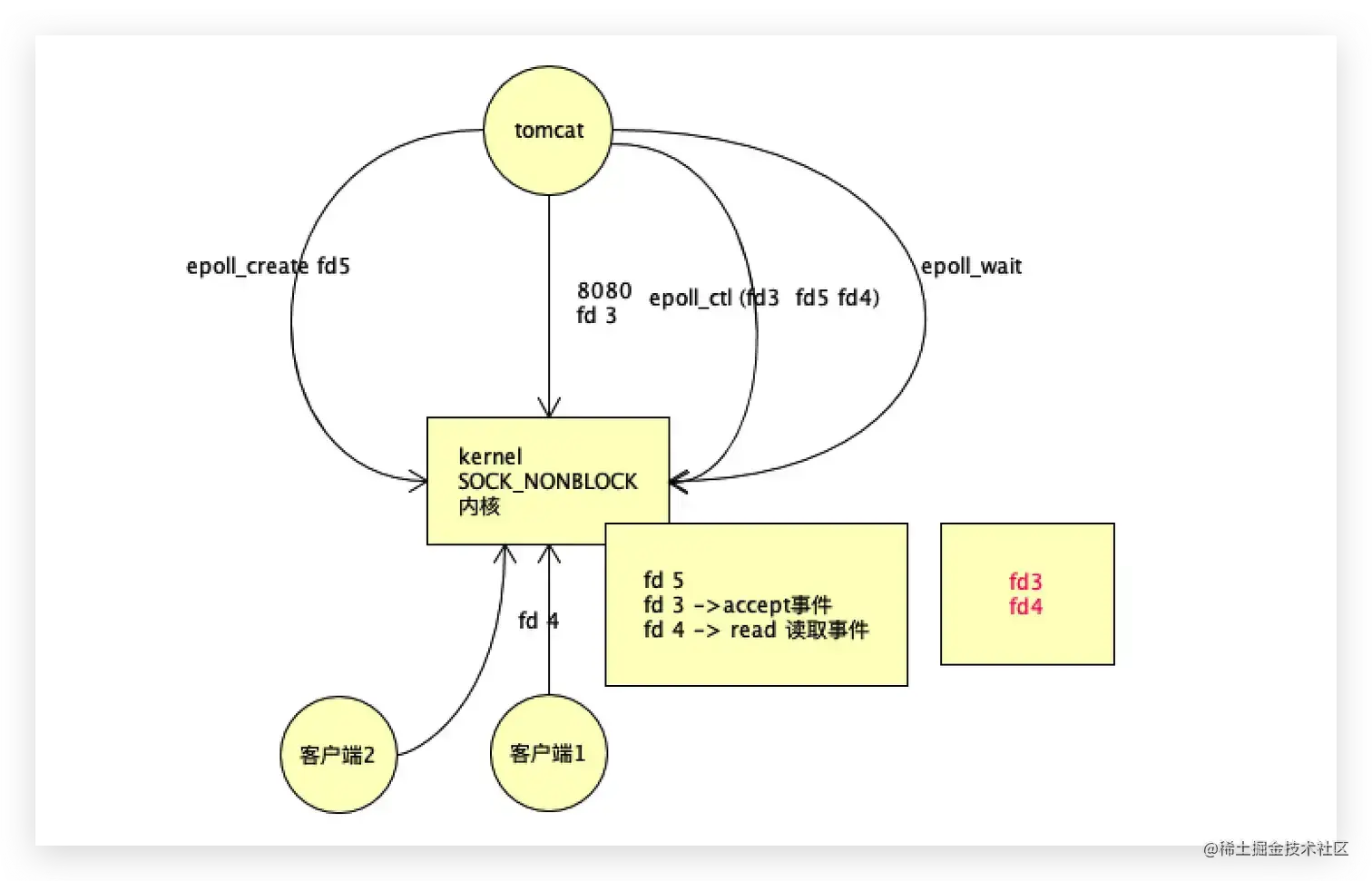 tomcat先去准备8080端口,得到一个文件描述符fd3,tomcat下一个指令是调用内核的epoll create,返回一个epoll的文件描述符,比如epoll的fd5,然后tomcat调用内核epoll_ctl,传入2个参数,一个是epoll的fd5,第二个参数是fd3。