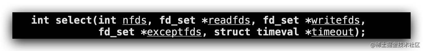 参数nfds表示有多少个文件描述符,readfds想读取的文件描述符集合,writefds想写入的文件描述符集合。