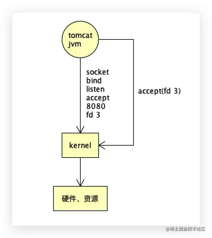tomcat是用java代码写的,交由JVM管理,JVM在内核调用了socket的bind、listen、accept这3个系统调用,才得到监听8080的文件描述符,比如文件描述符3,3就代表着监听的8080。
