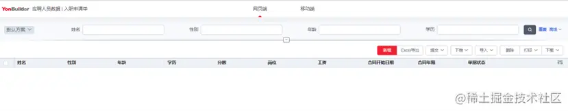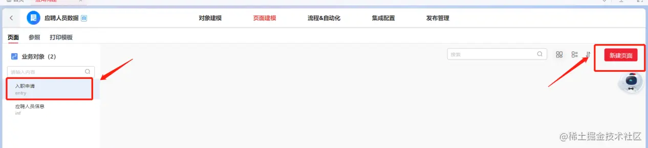 在完成实体发布后,进入页面建模界面,选中业务对象 “入职申请” 后点击新建页面,新建一个引用入职申请实体为元数据的单卡页面,点击预览可以看到实现效果如下图。