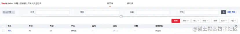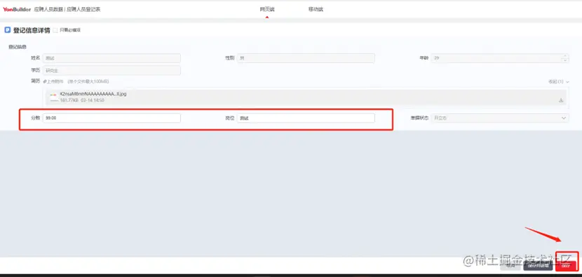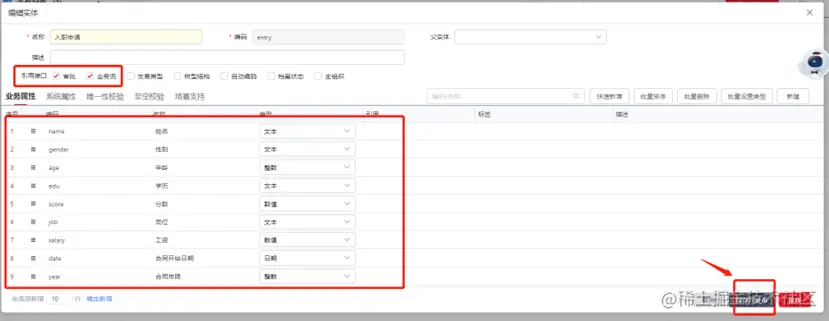 点击编辑对实体内容进行具体的配置,这里的字段除了包含登记信息中涵盖的姓名、性别、年龄、学历、分数、岗位字段,还新增了工资、合同开始日期、合同年限三个字段。实体配置完成后,同样点击保存并发布。