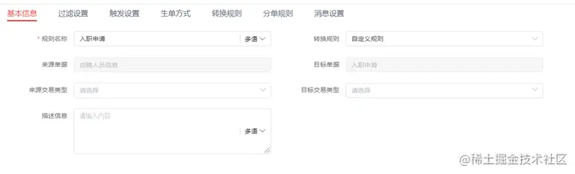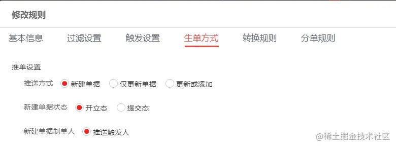 具体规则配置信息如下:其中,在触发设置中选中的单据生效时机代表单据需要在审批流程完成后自动触发推单规则。
