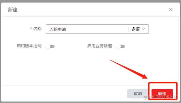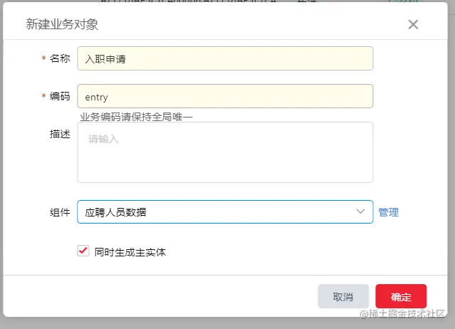 其次,由于一个业务对象只能包含一个主实体,因此新增一个名为入职申请单的业务对象,并勾选同时生成主实体,用于自动根据业务对象的命名生成一条实体信息。