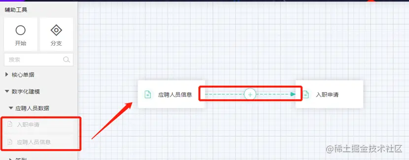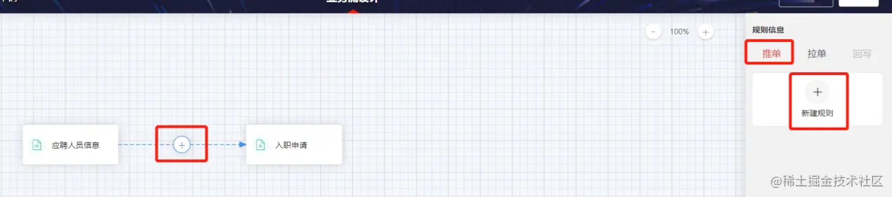 进入业务流配置后,将需要配置推单关系的两个页面从左侧菜单栏中拖拽至画布中,并添加由应聘人员信息至入职信息的连线关联两个页面,点击联系中的加号即可对期规则进行配置,在右侧的规则信息中选中推单并新建规则。