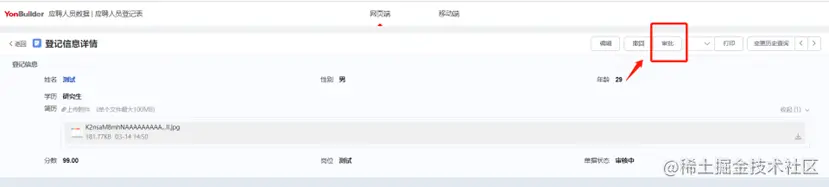 可以看到在 pc 端登记信息表中已同步该信息,配置好需要编辑的信息并提交审批后单据状态由开立态转变为已审核。