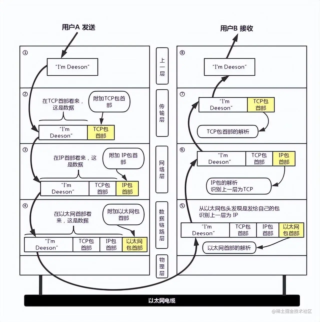 从 IP 传过来的 IP 包对于以太网来说就是数据。给这些数据附加上以太网首部并进行发送处理,生成的以太网数据包将通过物理层传输给接收端。