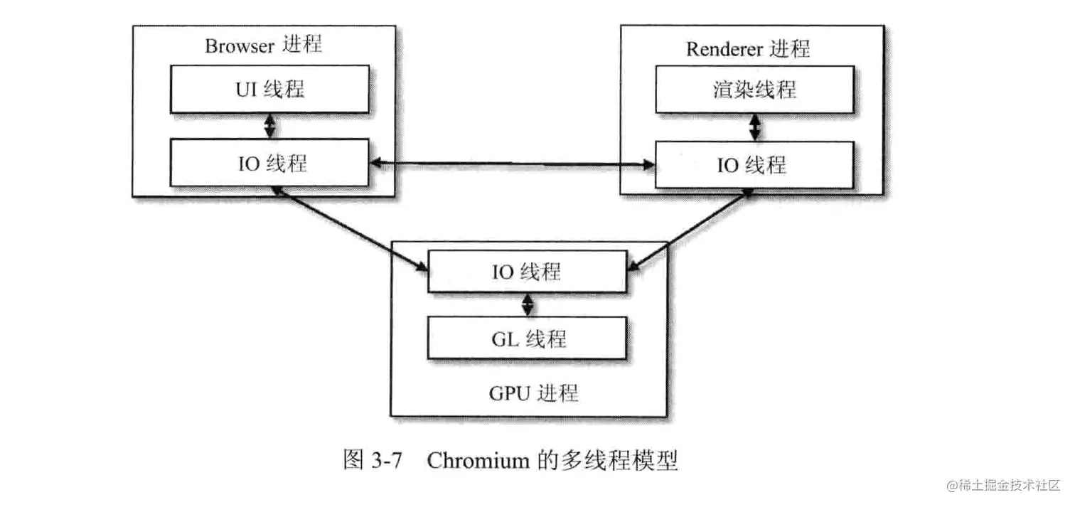 - Renderer进程的IO线程经过简单解释后交给渲染线程,渲染接受请求,加载和渲染网页(可能需要Browser进程获取资源和GPU进程帮助渲染)。最后把处理结果通过IO线程返回给Browser进程。