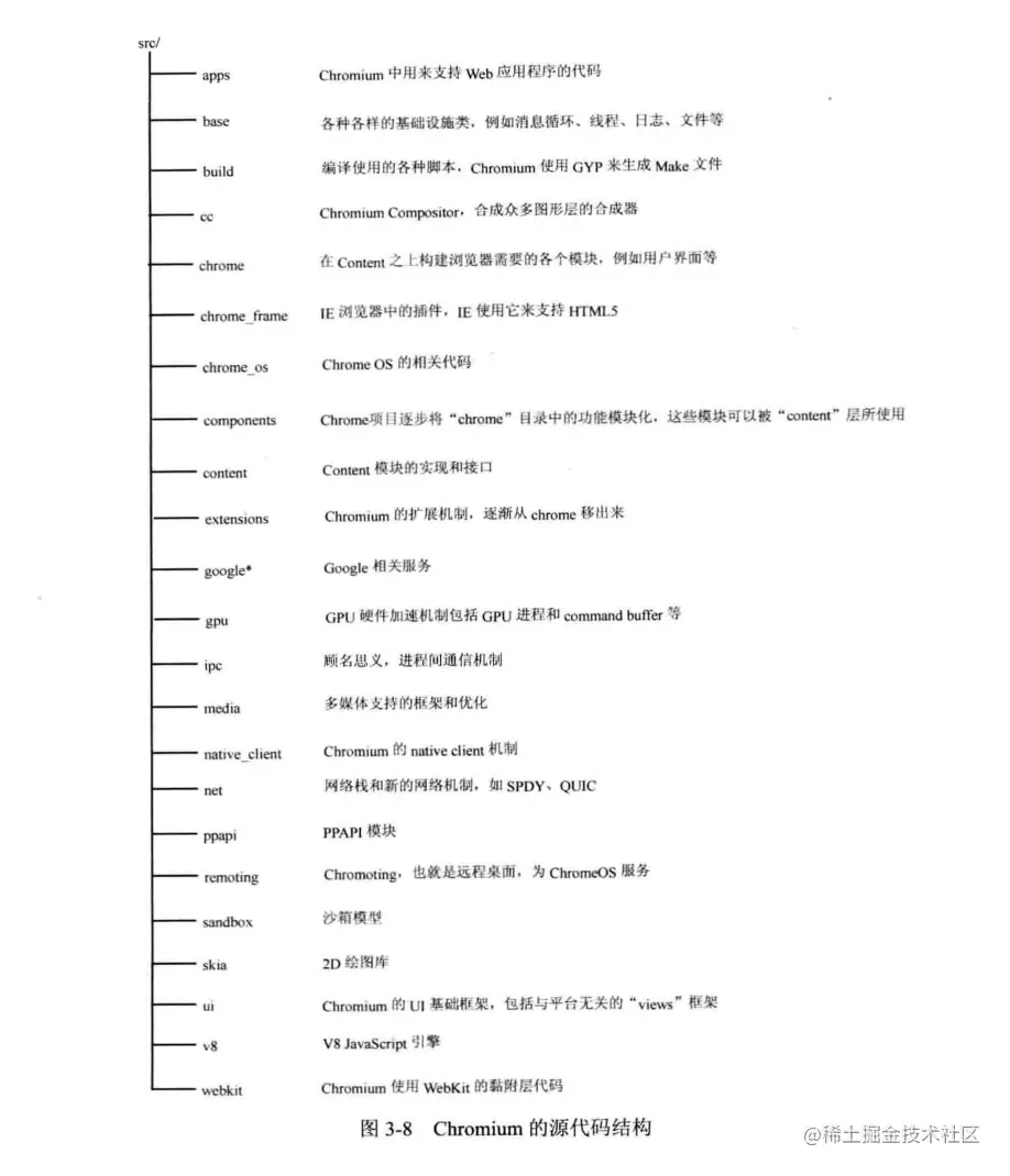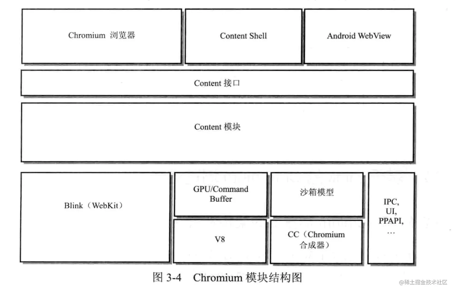 图3-4展示了Chromium的架构和模块。从图中可以看出,Blink只是其中一部分,和它并列的还有很多其他模块,包括GPU/Command Buffer(硬件加速架构)、V8引擎、沙箱模型、CC(Chromium合成器)、IPC、UI以及未列出的模块等。