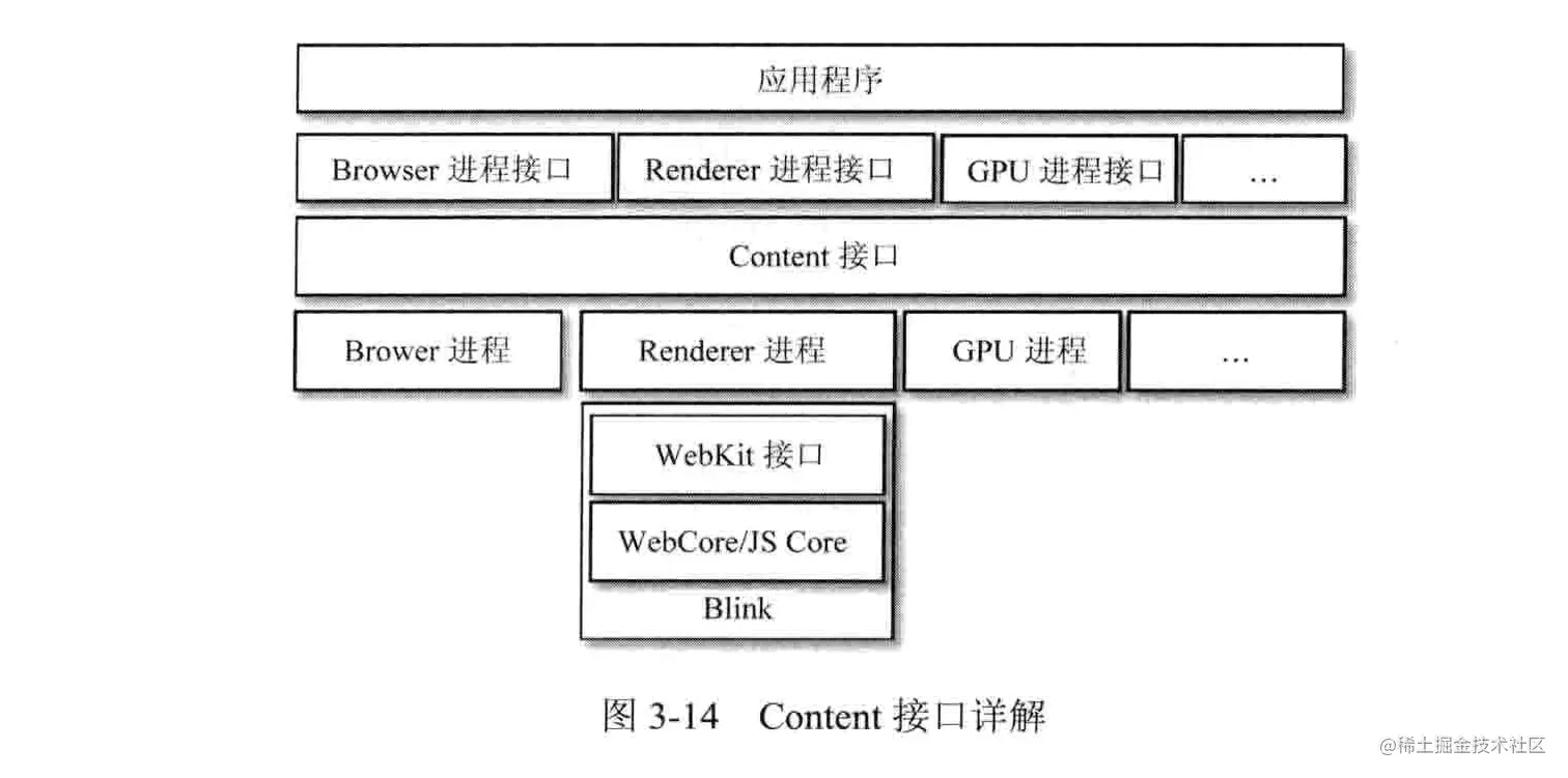 图3-14描述了webkit接口和Chromium多进程的关系,以及和content接口的关系。