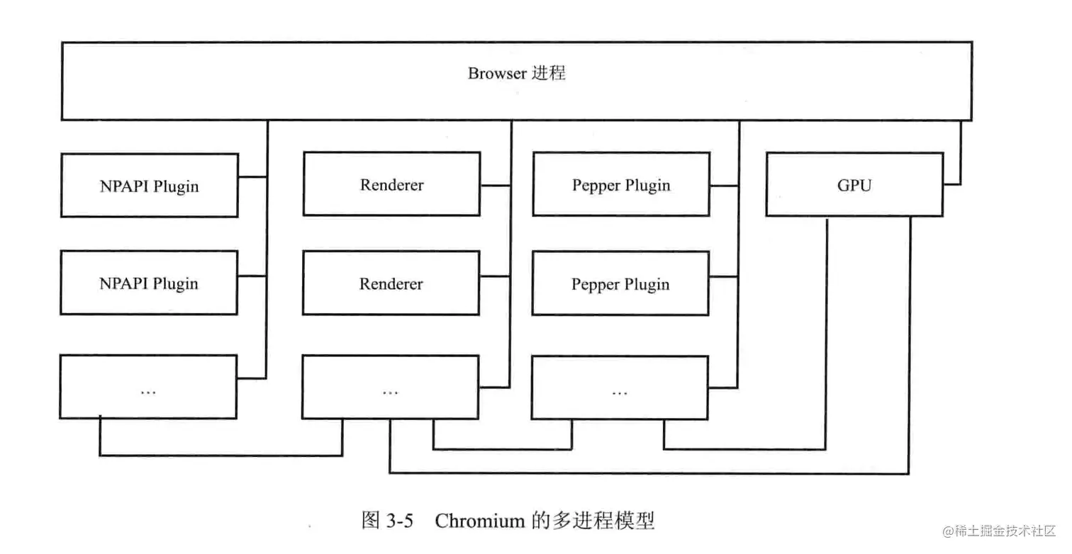 图3-5展示了最常用的Chromium多进程模型(Chromium架构设计灵活,可以通过设置改变进程模型方式)。图中的方框表示进程,连接线表示IPC(进程间通信)。