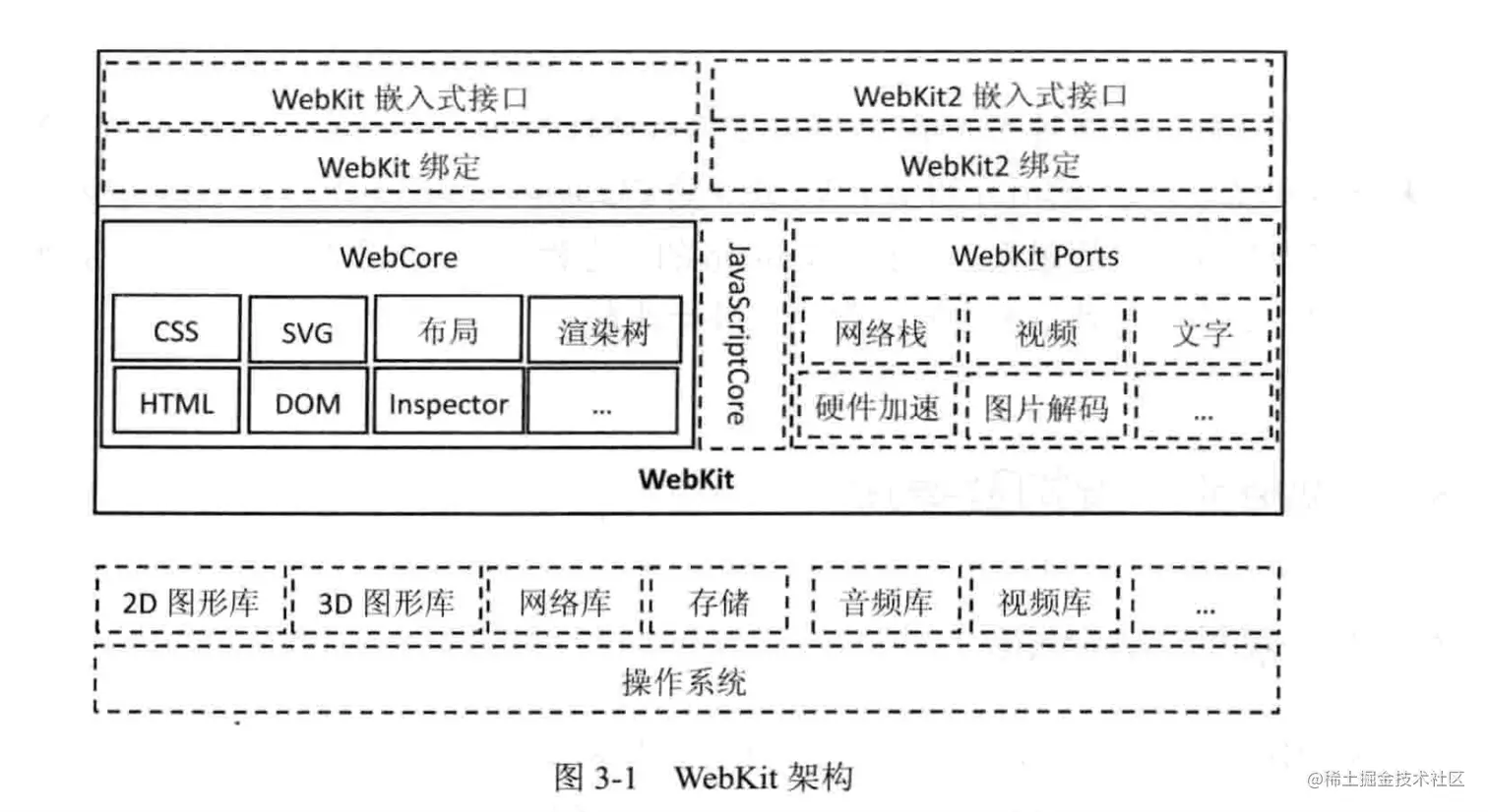 图中虚线框部分表示,该模块部分在不同浏览器对webkit内核的实现不同,也就是说不是普遍共享的。实现框表示,基本上是共享的。(注意,是基本上。他们中的一些特性可能不是共享的,可以通过不同的编译配置改变他们的行为)。